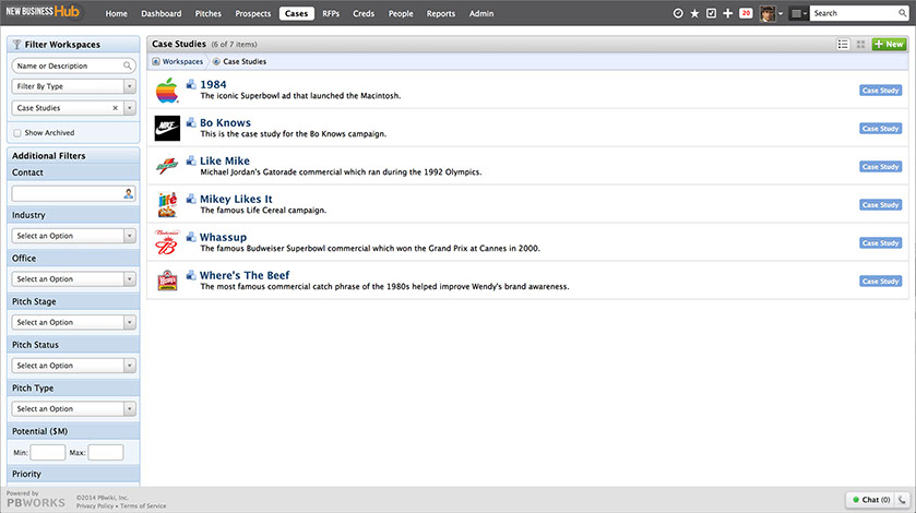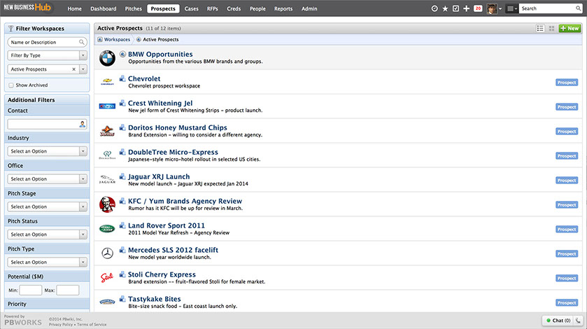 New Business Hub is powered by PBworks. We've been in business since 2005, and deliver results for agencies ranging in size from single-office boutiques to global networks and in focus from PR to social.